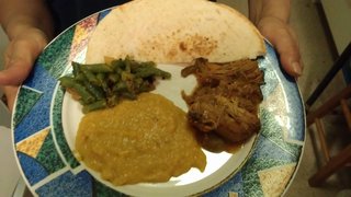 Balanced Meal: Green Beans, Daal, Chicken curry, Pita Bread
